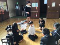 5年生の子どもたちが、てらかつ協議会の方から、てらいまち活性化の取り組み「ボラードに九谷焼陶板を設置する」の始まりや取り組みへの思いなどについて、お話をお聞きしました。
