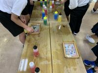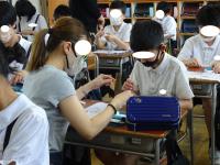 一人一人南極の氷に触った後、氷と水を入れたビーカーに耳を当て、数万年前の空気がはじける神秘的な音を聞きました。「ぴちぴち」「シャー」という小さな音に耳を澄まし、「聞こえる!」「聞こえた!」「めっちゃ小さい音や」など、めったにできない体験を楽しんでいました。