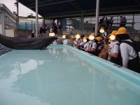 子ども達は、プールの授業がとても嬉しそう。冷たいシャワーも、はしゃがず、騒がず、ぐっとこらえて浴びています。まずは、水に慣れることが大切に、楽しく学習できるよう、取り組んでいます。