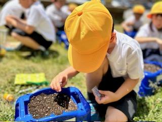 植木鉢の周りに肥料をひとつずつ丁寧に並べる姿は、朝顔への愛情があふれていました。