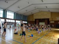始めに6年生のお兄さん、お姉さんと1年生と一緒に体育館で体操をします。いつもと違う様子に1年生は少し緊張気味でした。