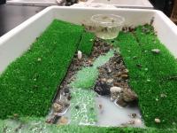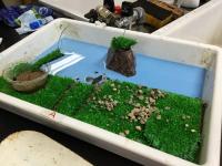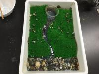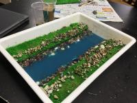 理科の時間の「流れる水のはたらき」の学習では、石や河原の様子の違い、水の浸食、運搬、堆積等のはたらき、川の水による災害等の学習の後、生き物がすみやすい川のミニチュアを考えて作る学習をしました。