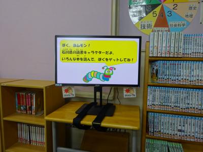 能美市より図書室にディスプレイ用パソコンを頂きました。図書室の入り口に設置し、楽しい企画等を子ども達に知らせています。子ども達が楽しく読書に取り組めるように有効に活用していきたいと思います。