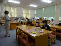 図書ボランティアの方が、どんぐり工作会を開いてくれています。コロナ対策のため、学年で日を決め、予約制で行っています。今回は、「どんぐりはなごま」づくりです。思い思いに絵を描いたり飾りをつけたりして、秋の工作を楽しんでいます。