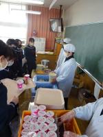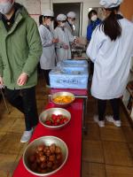 3月10日、6年生はセレクト給食でした。おにぎりとデザートを自分で選び、オレンジとイチゴ、ミートボールもついた豪華な給食でした。各クラスで先生を一人だけ招待し、静かにおいしくいただきました。1年間、最高学年として頑張ってきた6年生への感謝を込めた献立です。