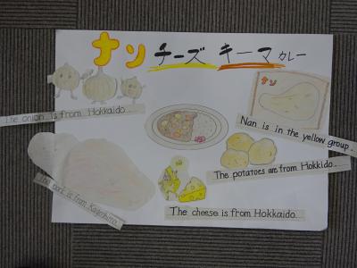 3月11日の給食献立は、チーズキーマカレーでした。6年生が外国語科の学習で考えた中から、全校児童に行った「外国カレーコンテスト」アンケートで1番になったメニューです。