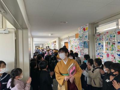 離任式の後、お世話になった先生に、たくさんの子どもたちが挨拶に来ていました。寺井っ子の優しさと温かさが感じられ、異動する職員にとっての花向けとエールとなりました。