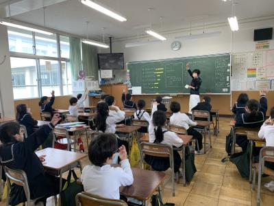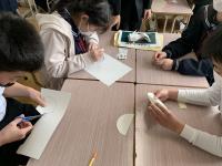 5年生は、「貿易ゲーム」を楽しんでいました。課題にある製品(図形)をつくり国連(先生)に買い取ってもらったり、自分の国(グループ)にはない資源を稼いだお金で買ったり。国の仲間と「どうしたらお金が稼げるか」相談してゲームに必死に取り組んだいました。算数の力、社会の力、コミュニケーション力、協働する力など、これまで培った力を使って生き生きと楽しんでいました。