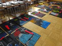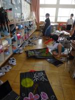 4年生は、運動会で団体演技南中ソーランを踊ります。一生懸命練習に取り組んできています。この日は、本番の衣装にそれぞれの名前の一文字と、思いを表す絵を描いていました。みんなかっこよく仕上がり、満足顔です。鉢巻にも「南中ソーラン、がんばるぞー」など、それぞれの思いを書きました。衣装を着て踊るのは、本番の1回のみ!みなさん、お楽しみに!!