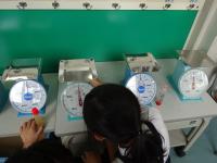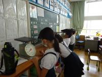 3年生が算数で、重さの勉強をしています。200gのばねばかりで測れるものは、何かな?と考えて、身近にあるものから選んで図ります。上皿はかりを使う間には、「0に合ってないんじゃない?」と言いながらメモリを確認し、合わせる姿も見られました。