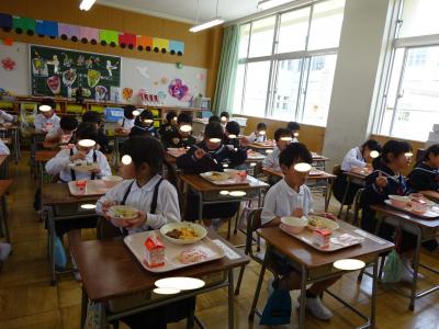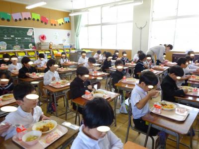 4月13日、1年生が入学して初めて給食を食べました。「学校の給食はどうですか?」の問いに、「おいしい!」「さいこう!」など、元気な返事が返ってきました。毎日たくさん食べて、元気に学校に通ってほしいです。