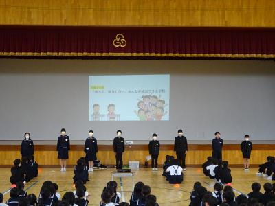 児童会役員から、児童会目標「明るく、協力し合い、みんなが成長できる学校」が紹介されました。そして、そのために、クラスの成長を「寺井っ子のあしあと」として職員室前に掲示していく取り組みを全校に伝えました。