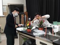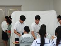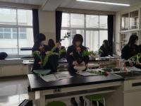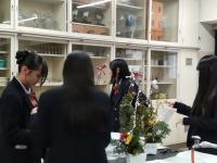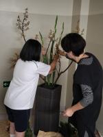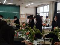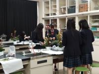 1、2年生が池坊の先生のご指導のもと、協力して共同作品の生け込みをしました。
