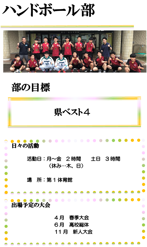 現在、ハンドボール部は2年1名、1年4名の計5名で活動を行っています。
