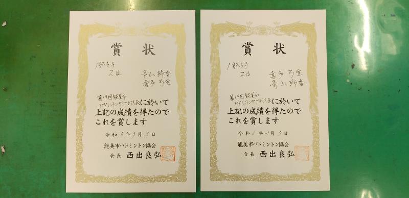 バドミントン部 能美市ダブルス大会成績