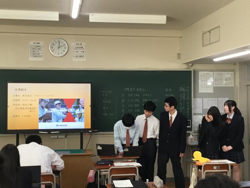 12月11日、1年生は5.6時間目に企業見学の事後発表会を開催しました。発表内容は、「高卒採用(人材確保)を増やすためにどのような取組をされているのか」という、企業が抱える人材不足の課題解決策を、高校生の視点から提案するものでした。
