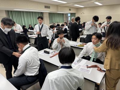 後半は、お辞儀の仕方など、マナー講座を実施していただき、いろいろ気を配らなければならない「ちょっと面倒くさい」社会人の流儀を一足早く感じている3年生でした。