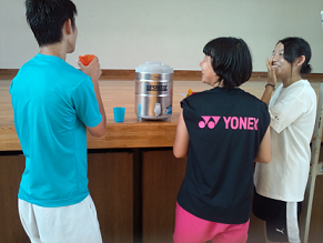 写真にもある大型ドリンクキーパー(タンク)を2つ新調しました。水分補給を十分に行いながら、「何を鍛える練習なのか」を意識したノック練習やゲーム練習で「バド力」を高めています。