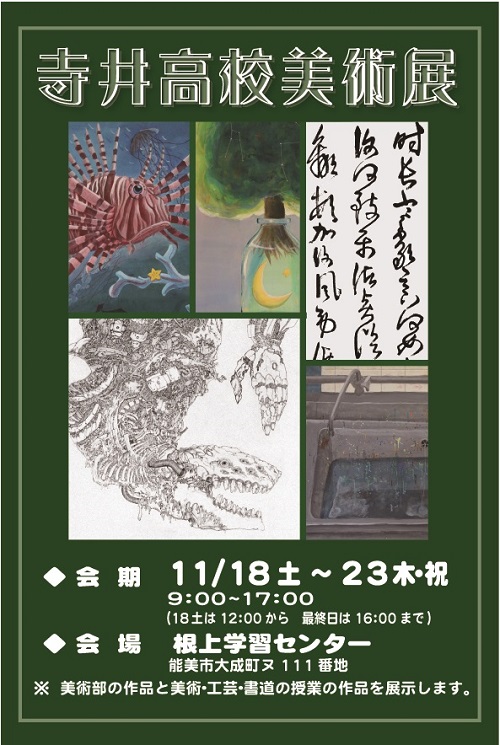 毎年開催しております「寺井高校美術展」のご案内です。この作品展では、本校の美術、工芸、書道の各授業および美術部の活動で制作した作品を展示いたします。