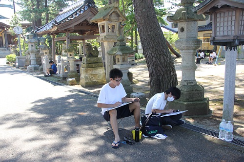 この写生会は今年で3年目を迎え、寺井町の街並みを写生するもので、毎年参加しています。今年は猛暑の中の実施となりましたが、日陰での場所取りと水分補給を心掛けて写生に取り組みました。