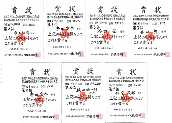 5月26日(木)~28日(土)にかけて石川県西部緑地公園で行われました県高校総体に出場しました。各種目6位(競歩、混成は4位)までが北信越大会への切符が得ることができ、その切符獲得を目指してチーム一丸となって挑んできました!結果は、男子走高跳・女子七種競技で優勝、男子三段跳・女子走幅跳で第2位、その他男子八種競技で第5位、男子走幅跳で第6位、男子円盤投・ハンマー投で第7位という素晴らしい結果となりました。その他にも自己記録を更新できた生徒も多く、これまでの練習の成果だと感じます。また、この総体期間中に、「自分はなにをしなければいけないのか」「すぐ行動しなければいけない」「チームのために一丸となって応援しよう」といった気持が強くなり、個人・チームとして成長していったようにも思えました。陸上競技部の生徒たちは、この自分を試す・試されるような機会を、自分を成長させる場に変えることができていました。