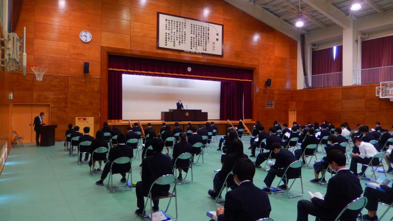全員がマスクを着用し、間隔を2m空けての集会でしたが、学校再開に向けて各課からの説明を真剣に聞くことができました。