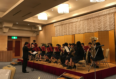 10月17日(火)能美ライオンズクラブ55周年記念祝宴のオープニングで、「銀河鉄道999」「J-BEST」「情熱大陸」などを演奏させていただきました。いつもとは違う厳粛な雰囲気の中、緊張しながらでしたが、地元企業の皆さまに演奏を聴いていただき、良い経験となりました。