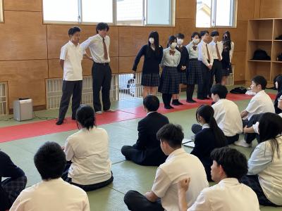 本校の総合学科特有の系列紹介や、特色のある授業について説明を行いました。1年生は自分の将来のことを考えながら、真剣に説明を聞いていました。