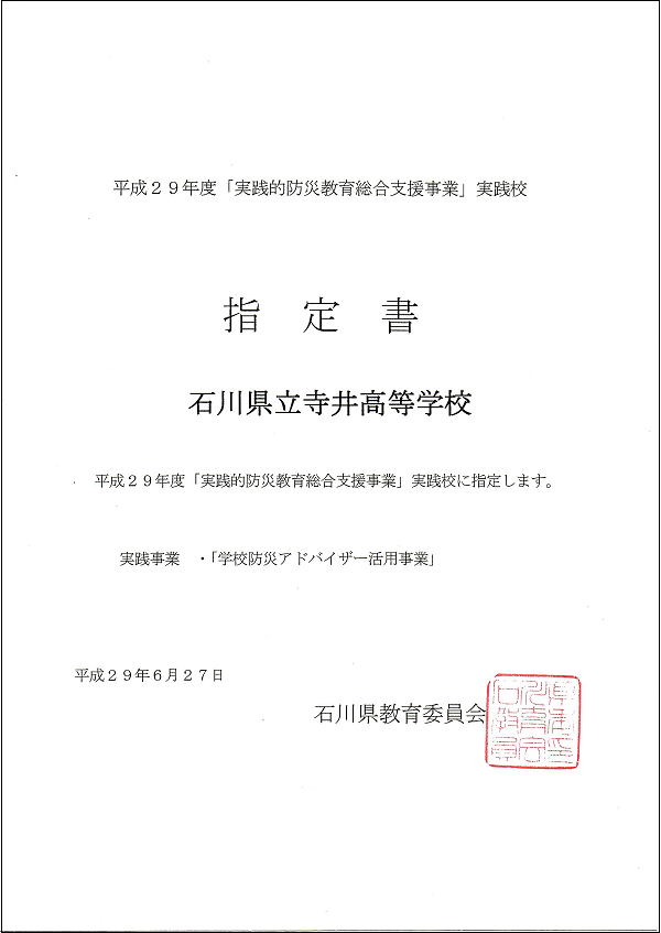 平成29年度「実践的防災教育総合支援事業」実践校に指定されました。