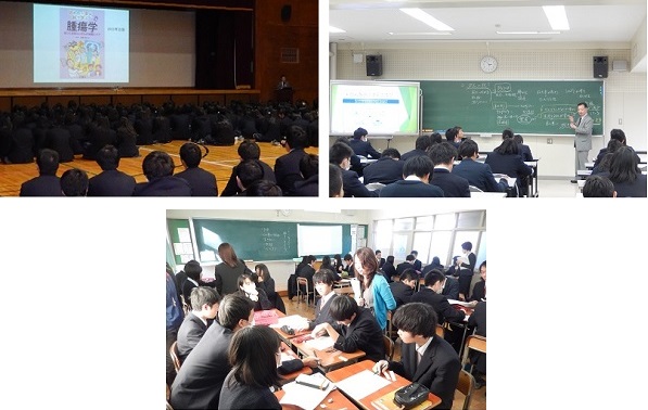 11月22日(水)、27日(月)がん教育推進のモデル校として、がん教育に関する取組を行いました。外部講師として、金沢医科大学腫瘍内科学主任教授元雄良治氏、萌の会代表和田真由美氏をお招きし、保健体育科教諭・養護教諭とティーム・ティーチングで授業を行いました。また、全校生徒対象に講演会も実施していただきました。身近な病気になりつつあるがんに対し、生徒が興味を持つきっかけとなる取組でした。