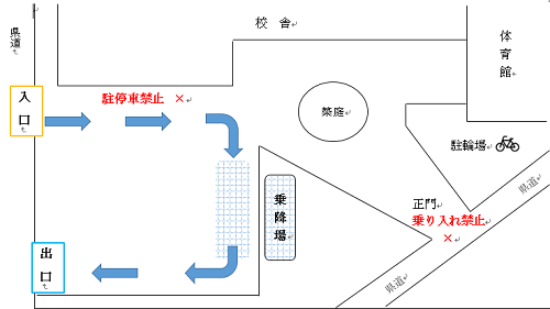 自家用車による生徒の送迎については、かねてより本校駐車場内の指定場所での乗り降りをお願いしています。しかしながら、最近、校門前など指定されていない所での乗り降りが度々見受けられます。これは、大変危険です。安全第一の観点から指定場所での乗り降りをお願いいたします。