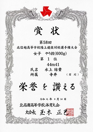 長野県松本市で開催されました北信越高等学校陸上競技対校選手権大会において、本校から出場した3年の水上結貴さんが女子やり投げ(600g)で44m41の記録で、見事第1位を獲得しました。