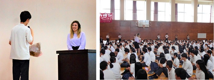 1学期終業式に伴い、1年間お世話になったALTのナオミ・J・ウィット先生の離任式が行われました。ナオミ先生からお別れの挨拶の後、生徒代表のESS部部長の島田君から感謝の言葉と花束が贈られました。