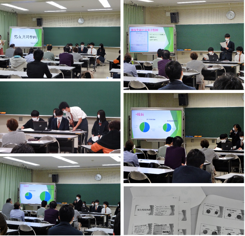 8月、10月と2回の学習会で、男女共同参画について学んできた成果の報告会が12月17日(木)に本校で開かれました。ワークライフバランス北陸の理事長、事務局長および地域の男女共同参画推進委員の方が出席する中、本校生徒会のメンバーが高校生の未来予想図と職業に対する男女の偏見について発表しました。