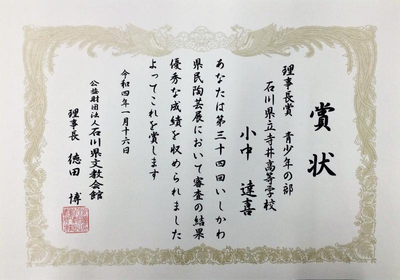 32H小中達喜さん(辰口中出身)が、第34回いしかわ県民陶芸展 青少年の部で、理事長賞を受賞しました!!おめでとうございます。