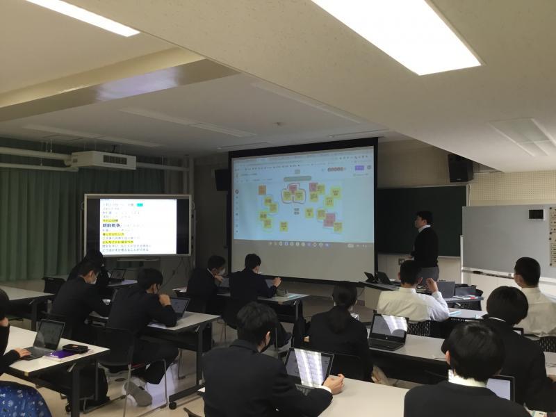 「日本史A」では、「冷戦」をテーマに、先に予習を指示していた生徒がまとめた1枚のシートを全体で共有をしてから、授業に入りました。冷戦についてのNHKの動画を見ながら、所々で、「朝鮮戦争でなぜ日本は経済成長できたのか」など具体的な問いを投げかけて、生徒は、クロームブックを使って調べることで授業を進めていきました。自分たちで調べながら授業を進めることで、冷戦全体の流れを理解することができました。