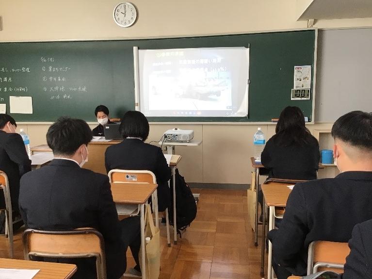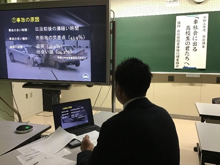 2月9日(水)、石川県損害保険代理業協会の清水篤史さんに来校いただき、3年次生を対象に出前講座「車社会に出る高校生の君たちへ」を行いました。