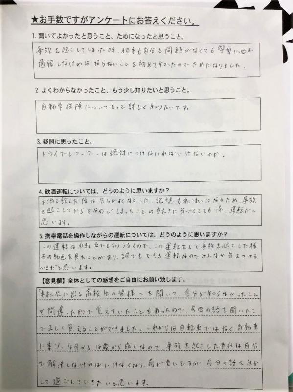 4月から車に乗る生徒が多いと思われますが、実際に事故が起きた時にどう対応してよいか、保険の必要性など知らない生徒がほとんどでした。