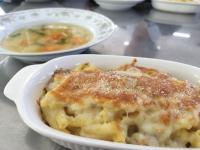 生活副系列3年次の選択授業「フードデザイン」にて、調理実習を行いました。今回の献立はグラタンとコンソメスープです。グラタンは小麦粉や牛乳の特性についての学習をふまえ、ホワイトソースから作りました。