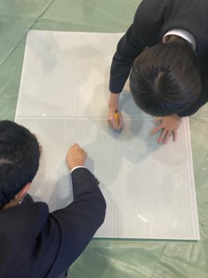 プラ段ボールは固くて苦労しながらも、協力してやり遂げることができました。