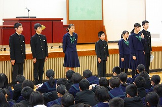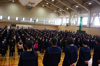 1月8日(水)1限、始業式の表彰伝達では、JOC石川県選抜チームとして全国優勝を果たした6名の女子ハンドボール部員が紹介されました。また、校長先生のお話の後、新しいALTのチャ・ミーさんも挨拶をしました。最後は、生徒会新役員がリードし、全校による校歌斉唱で式を閉じ、3学期がスタートしました。