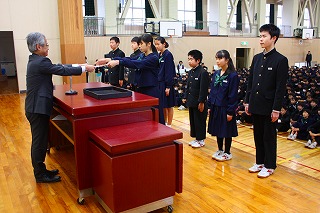 12月24日(金)、来年度前期の生徒会任命式を行い、新役員一人一人に校長先生から任命書が手渡されました。続いて行われた2学期終業式では、表彰伝達の後、校長先生から新しい年に向け決意を持ち、目標とする具体的な姿を思い描いてほしいとお話があり、今年最後の校歌斉唱で式を閉じました。