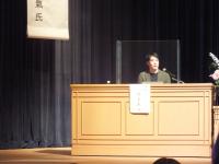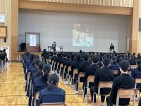 根上文化会館に市内3中学校の1年生が集まり、「ようこそ先輩」講演会がありました。