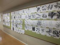 1年生の学年掲示板は美術の作品。2年生の教室前には総合的な学習の時間で取り組んだ「上級学校調べ」が