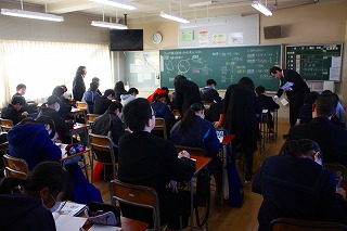 2月2日(金)3・4限に校内研修を行いました。今回は、数学科の森教諭が1年5組で「数学的な見方や考え方」の育成を目指した研究授業を行い、その後、県教員総合研修センターの指導主事からアドバイスを受けました。