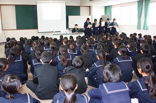 2月20日(火)午後、生徒会役員が寺井・粟生・湯野の3小学校に分かれ、6年生を対象とした中学校説明会を行いました。英語劇や英語クイズを楽しんだ後、中学校の勉強や部活動、学校生活などを生徒目線でわかりやすく説明しました。6年生からの質問にも上手に答え、有意義な会となりました。