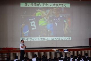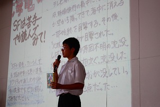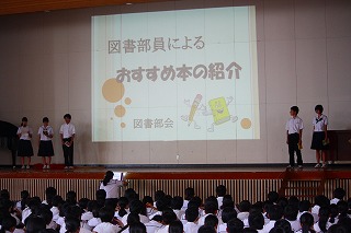 7月3日(火)6限、全校集会を行いました。表彰伝達の後、校長先生からは「仲間を大切にすることが、自分の成長に繋がる」とのお話を聞きました。次に、図書部の新企画として、手書きのポップを用いて代表生徒がおすすめの本も紹介しました。また、体育祭の団抽選や後期生徒会の任命式も行いました。