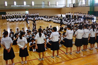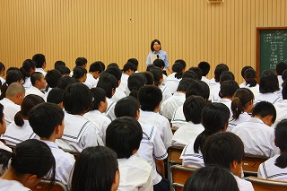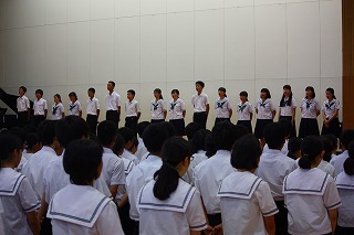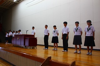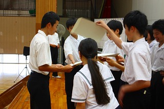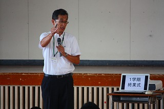 7月20日(金)、1学期終業式では、先日の県大会等の表彰伝達の後、1年「寺井見て歩き」、2年「金沢見て歩き」、3年「修学旅行」について代表生徒がふり返りました。夏休みに向けては、校長先生からは「やる気スイッチの入れ方」について、生徒指導主事からは「寺井中ネットルール」についてのお話もありました。また、7月末で退任される辰野葵先生が挨拶を行い、生徒との別れを惜しみました。最後に、全校生徒が校歌を斉唱し、1学期を締めくくりました。