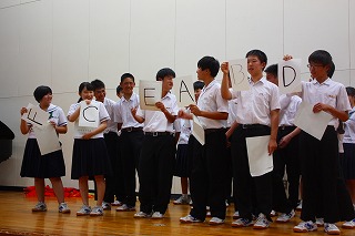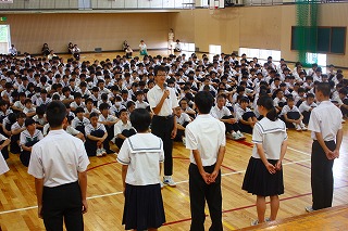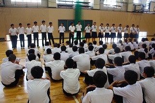 7月11日(水)6限、県中学校体育大会、県通信陸上大会、県吹奏楽コンクールの激励会を行いました。各部主将が決意を述べた後、生徒会長と校長先生が激励の言葉を送りました。また、その後、体育祭の結団式も6団に分かれて行われ、団長を中心に本番に向けての熱い取り組みがスタートしました。※県体等の日程については「お知らせ」に掲載していますので、ご覧ください。