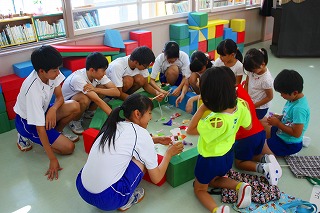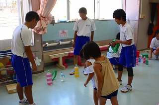 3年家庭科では市内保育園で保育実習を行っています。生徒が手作りのおもちゃを持って訪問し、園児と積極的に関わりながら、遊びを通じて楽しく保育について学んでいます。